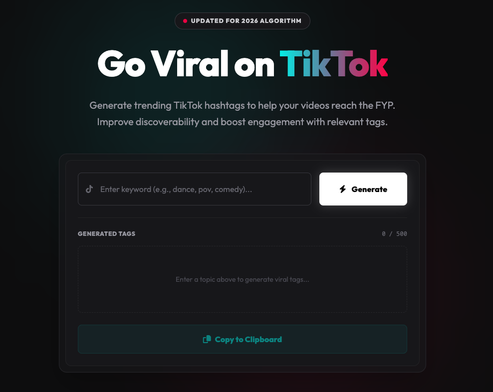 Boost your reach on TikTok and YouTube with the TikTok & YouTube Hashtag Generator PHP Script. This lightweight and powerful tool helps creators, marketers, and businesses generate trending and relevant hashtags instantly to improve visibility, engagement, and content performance. The script is super fast, 100% secure, and does not require any paid third-party APIs. It is easy to set up, SEO-friendly, Google AdSense compatible, and can be hosted smoothly on any shared hosting. Backed by Web Hub exclusive support, this script is perfect for launching your own hashtag tool or SaaS-style service.
